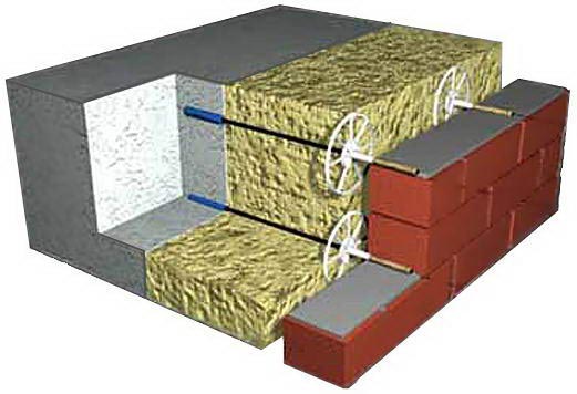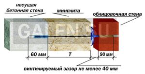 где Т-толщина слоя утеплителя, 40 мм — величина воздушного зазора, 60 мм — минимальная глубина забивки гибкой связи в монолитную стену, 90 мм — минимальная глубина заделки гибкой связи в облицовочный слой.