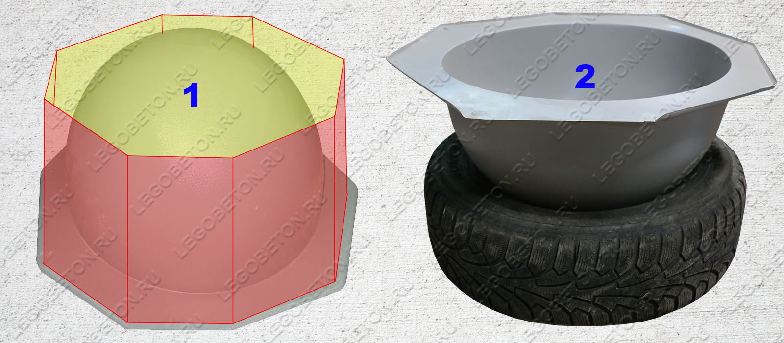 Более простой вариант — 2 — установка пластиковой формы для антипарковочной полусферы в автомобильную покрышку от легкового автомобиля. Такой вариант не требует никаких дополнительных работ. Благодаря тому что давление смеси в полусфере равномерно распределяется, геометрия отливки не будет нарушена. Главное (как написано в начале) правильная расформовка при поднятии полусферы, иначе будет замятие бортов формы.