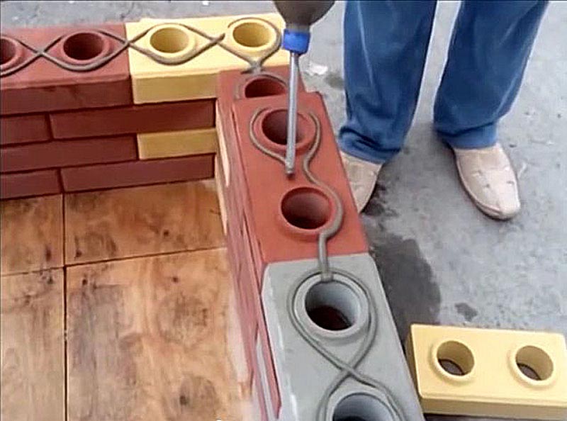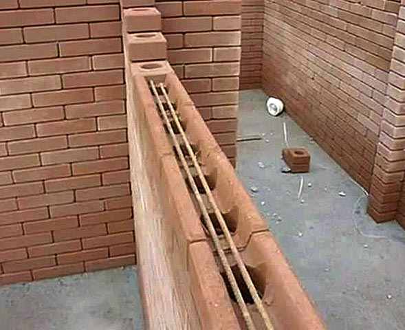 Для придания большей прочности несущих стен, как правило, дополнительно используют стеклокомпозитную арматуру АКС-8 или равную ей по прочности металлическую арматуру AIII-12, которая помещается в соответствующие технологические отверстия, которые в последствии заливаются бетонным раствором.