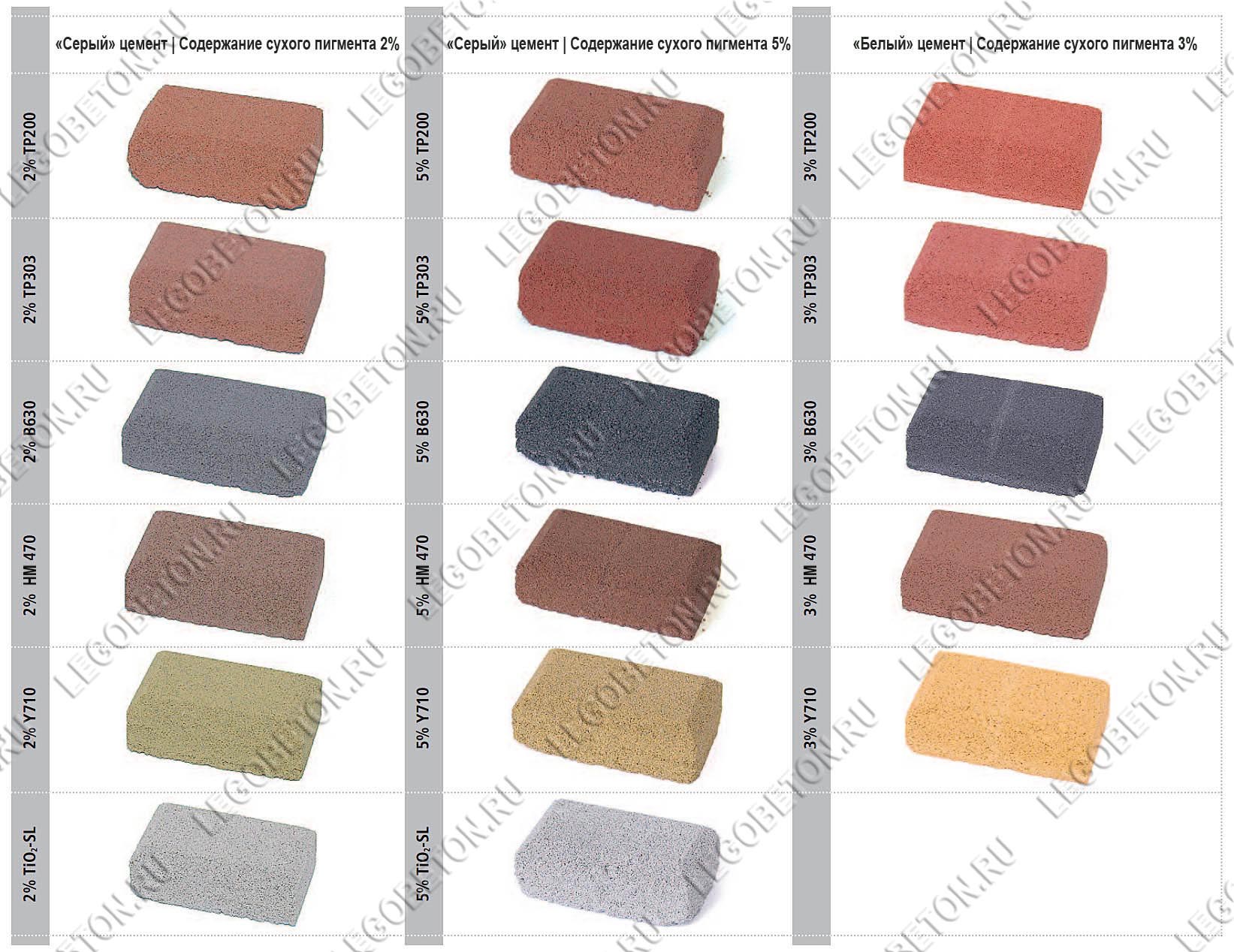 Расход пигмента для бетона определяется не только глубиной цвета который планируется получить, но и цветом используемого цемента. При использовании серого цемента цвета получаются менее яркими, а красителя требуется больше. Это оправдывает использование при изготовлении тротуарной плитки , облицовочного камня и малых архитектурных форм более дорогого белого цемента. По нижеприведенной таблице вы можете оценить влияние расхода железоокисного пигмента на цвет готового изделия при учете типа используемого цемента