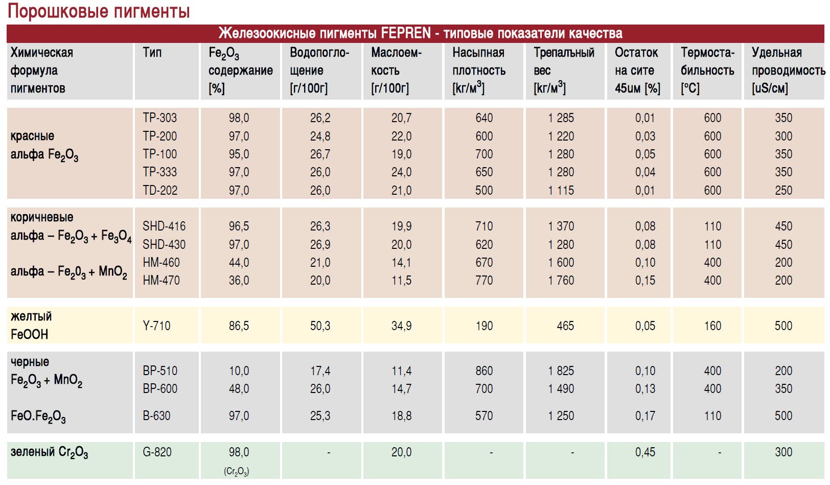 Технические характеристики пигментов FEPREN (сводная таблица)
