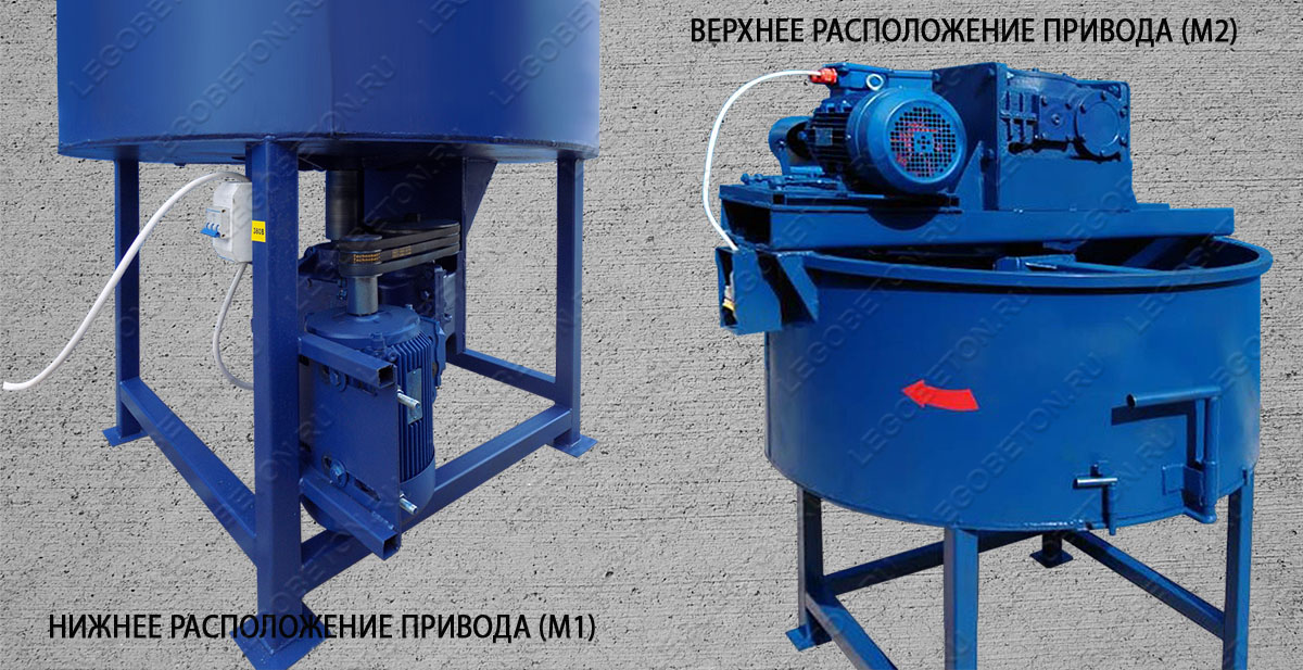 Обычно удобнее в эксплуатации смеситель с нижним расположением привода. Но при установке в технологическую линию, когда актуально использование всего нижнего пространства в зоне окна выгрузки вы можете купить принудительный смеситель с верхним расположением привода.