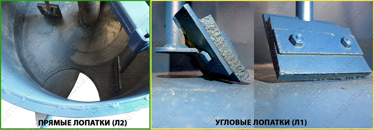 Угловое расположение лопаток позволяет эффективно перемешивать смесь при неполной загрузке смесителя, а прямые лопатки более эффективны если работа смесителя предполагается в основном с максимальной загрузкой.